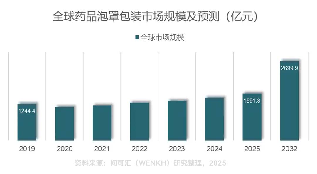 根据问可汇(WENKH)深度研究分析,2025年全球药品泡罩包装市场规模已达1592亿元,预计未来将以7.84%的年复合增长率持续扩张,至2032年市场规模将攀升至2700亿元。
